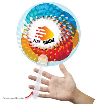 Hand held fan with coloured handle and your full coverage custom design on solid white blade – ideal for keeping cool and waving at sporting events. For orders of 10,000 up we’ll match the ABS Handle to your PantoneĀ® Colour choice.