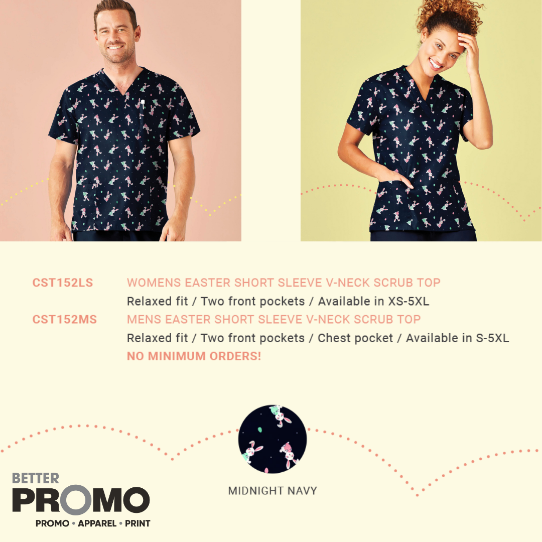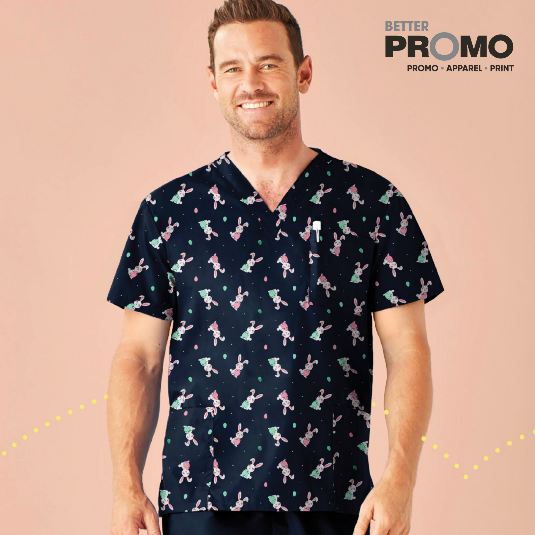 The Easter Short Sleeve V Neck Scrub Top is made from 100% Cotton and id soft and breathable. Features multiple front pockets and side splits with a fun bunny print. If you have children as your patients or you are working in the children ward, wearing printed scrubs can spread positivity, good vibes and a fun filled environment. Even the BIG kids won’t be able to not smile 🙂