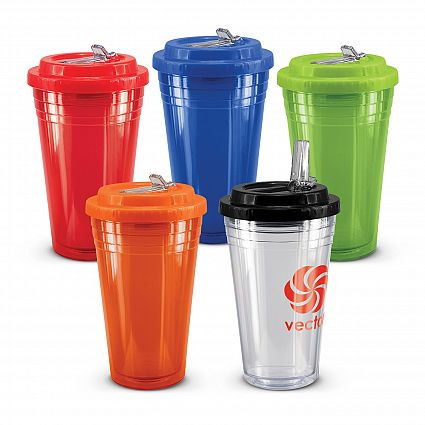Recyclable 470ml double wall, screw top tumbler with a leak proof flip valve drinking straw. The double wall technology keeps drinks cold for longer and significantly increases the time it takes ice cubes to melt.