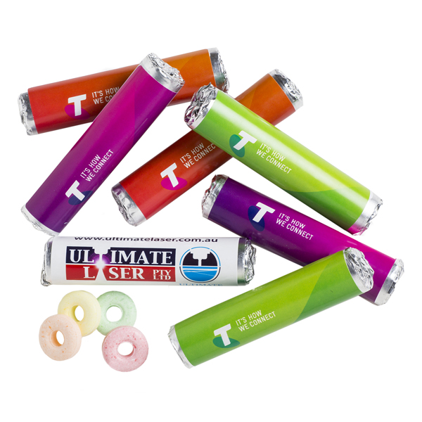 12 Fruit Flavoured Holey Lollies in roll with branded wrapper