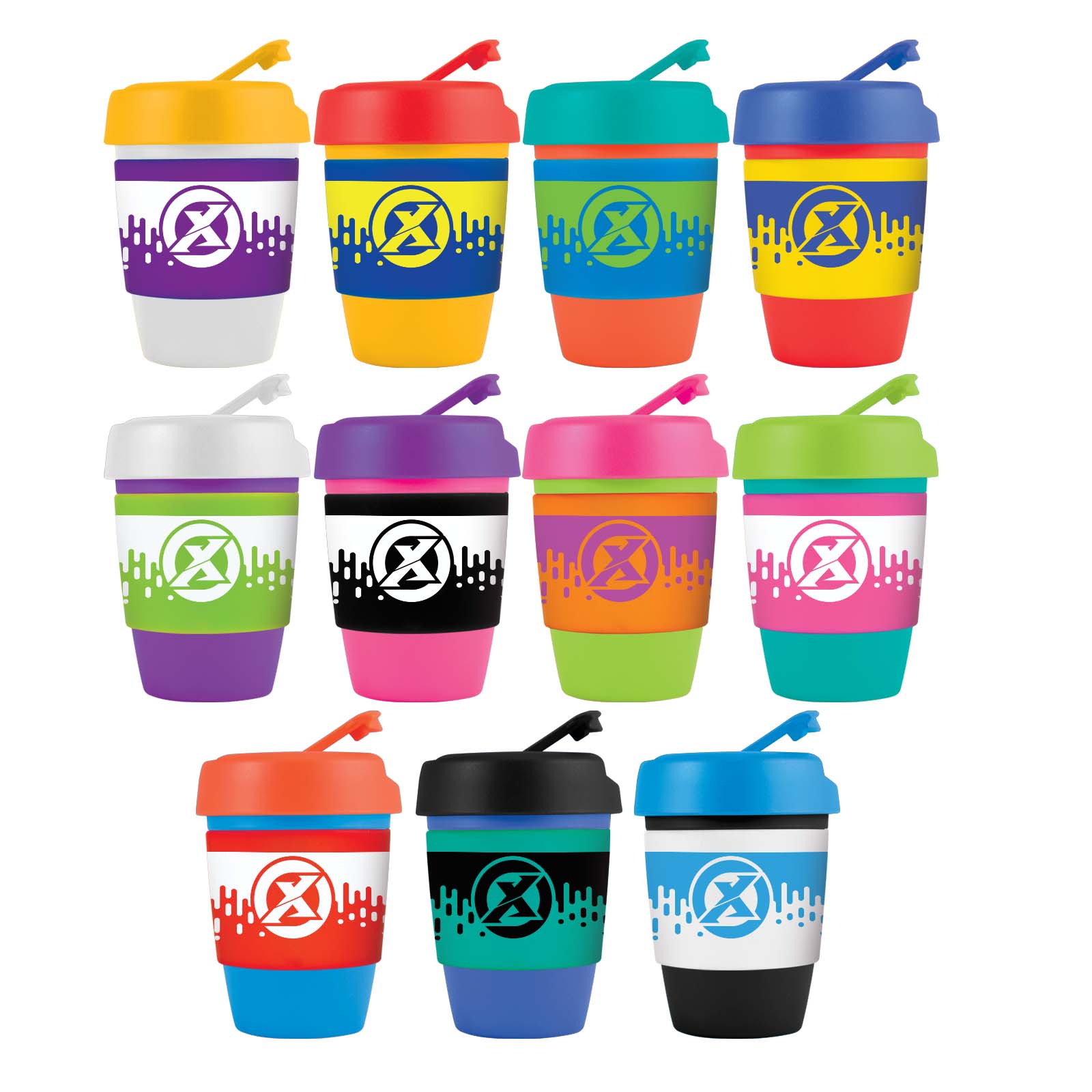 The Kick Eco Coffee Cup is a 320ml reusable coffee cup with heat resistant silicone sleeve and screw on lid. It is made from a 50/50 blend of wheat fibre and BPA free polypropylene.Nominate your choice of lid and silicone sleeve colours. BPA free. Microwave safe. Not recommended for dishwashers. Your reusable cup is designed to retain heat so you can sip your coffee over a long time without it getting cold. Reusable plastic coffee cups with lids help you avoid spilling your coffee by accident. They are great for the environment too with no waste. Printed with your logo, your brand will be in front of your clients for a long time.