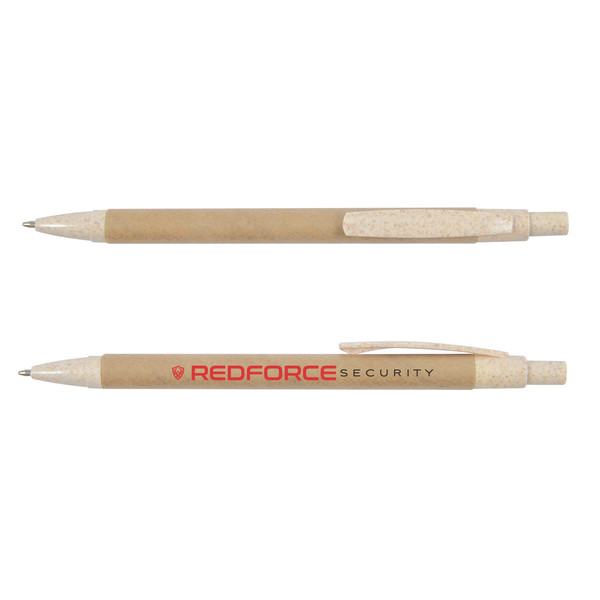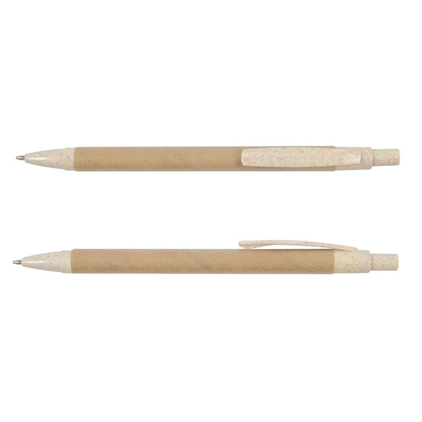 • Cardboard barrel ballpoint pen with a 50/50 blend of wheat fibre and polypropylene button, clip and tip.
