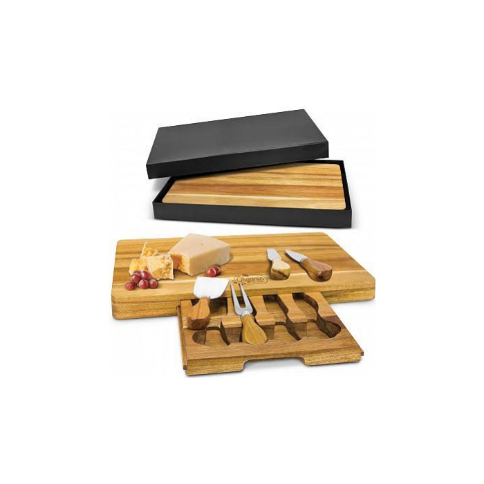 Elegant cheese board which is manufactured from FSC approved acacia wood. It has four soft non-marking pads on the base and a compact drawer which opens to reveal a set of three cheese knives and a cheese fork. Montgomery laser engraves to a natural etch and is beautifully presented in a matt black gift box. Wood is a natural material which produces unavoidable variances in the grain pattern, colour and branding.