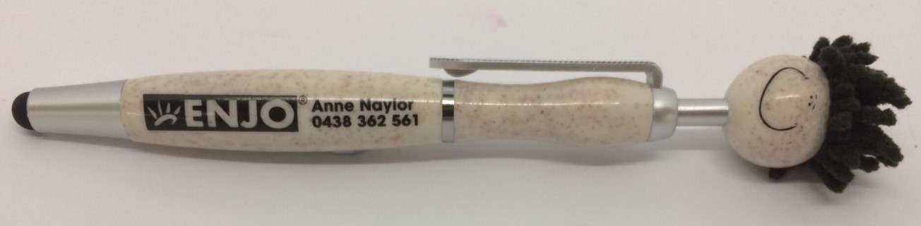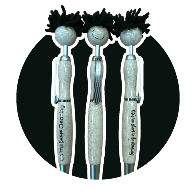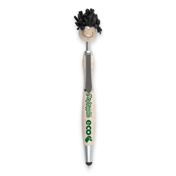 Mop Top Eco Pen is a push button ballpoint pen / stylus with microfibre hair, suitable for cleaning touch screen surfaces. Fun for all. Distinctive when sitting in pockets. Get your message checked out by all who meet a mop top! Mop Tops are a fun promotional item that grab more attention for end users. Optional black suede velvet pouch.Writing distance: 2.1 kilometres. TC roller ball. Nero pigment ink. Get noticed with these quirky Mop Top ballpoint pen figures. Includes a pen, stylus and microfibre cleaner. Barrel section & head made from a 50/50 blend of wheat fibre and BPA free polypropylene.