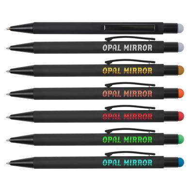Soft feel, aluminium barrel ballpoint pen with black accents and coloured stylus. Optional black suede velvet pouch.