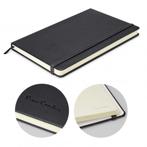 The Pierre Cardin Notebook Medium is a premium notebook created by Pierre Cardin in a medium sized format. This premium notebook has 96 leaves (192 pages) of acid free lined paper and features a textured PU leather finish hard cover with expandable pocket inside the back cover. Other features include a book mark ribbon and an elastic closure band. A Pierre Cardin logo is tastefully debossed on the back cover and subtly printed on the bottom corner of each page. What a fantastic way to co-brand!