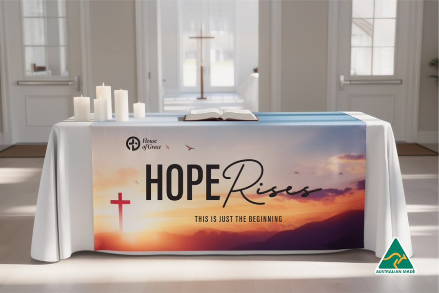 Make your brand impossible to miss with custom table runners – the perfect finishing touch for trade shows, expos, conferences, retail displays and corporate events across Australia. Designed to elevate your presentation, these sleek and professional runners transform any standard table into a powerful branding tool.