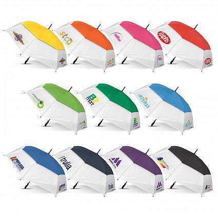 Auto open 76 cm, eight panel sports umbrella manufactured from rugged 190T showerproof fabric. It has a fully vented double panel wind proof canopy complete with eight fibreglass ribs and a super strong fibreglass shaft. Other features include a contoured, soft touch rubber lacquered grip, plastic tips, double Velcro ties and the option of full colour printing on the white panels