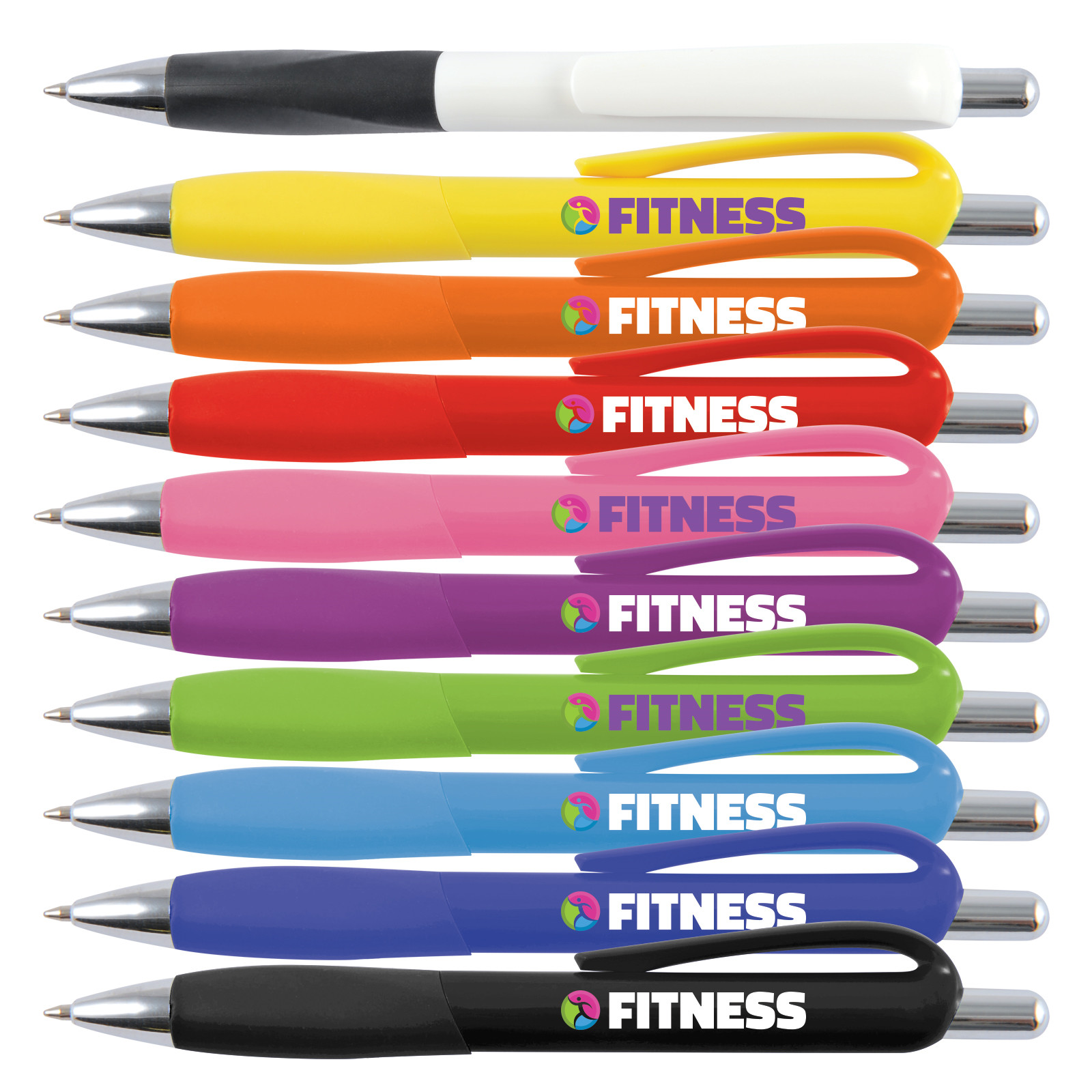 Gloss barrel push button ballpoint pen with rubber grip and chrome accents.