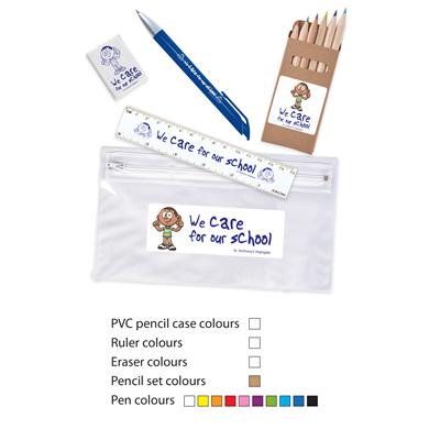 Stationery Set in pencil case including eraser, 15cm ruler, coloured pencils in pack & octave ballpoint pen.