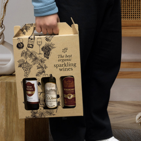 The Wine Carry Pack Triple is a professional custom wine presentation box made from durable 1.5mm e-flute corrugated cardboard with display windows. This box holds two standard wine bottles, perfect for gifting and building strong brand recognition. Featuring a convenient carry handle, the box’s exterior can be customised with CMYK digital print. It is supplied flat-packed for easy postage and storage, and its self-locking design ensures hassle-free assembly. The assembled dimensions are 262mm x 88mm x 335mm (LxWxH). Using a printed wine carry pack is a good idea because it provides a convenient and secure way to transport wine bottles. It offers protection against breakage and keeps bottles upright, preventing leaks. Additionally, the printed design adds a touch of elegance, making it a stylish and personalized accessory for wine lovers.